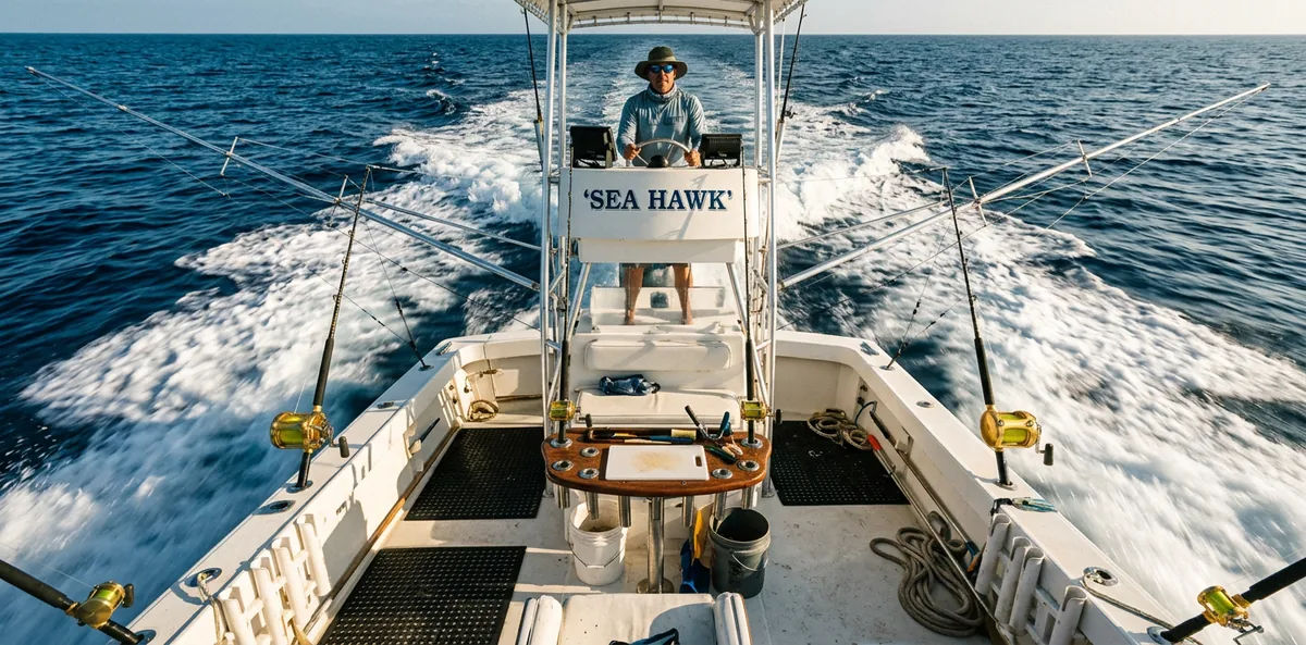 El barco importa: la mayoría de chárters de altura usa embarcaciones sportfishing de 28–55 ft con flying bridge, silla de pelea, outriggers, downriggers y torre de atún para avistar. Un día típico empieza antes del amanecer, navega 1–2 horas mar adentro hacia estructura conocida (montes submarinos, líneas de corriente, boyas FAD), despliega un patrón de trolling de 6–9 líneas con señuelos vestidos y cebos naturales, y curriquea a 6–9 nudos hasta que algo pica.
