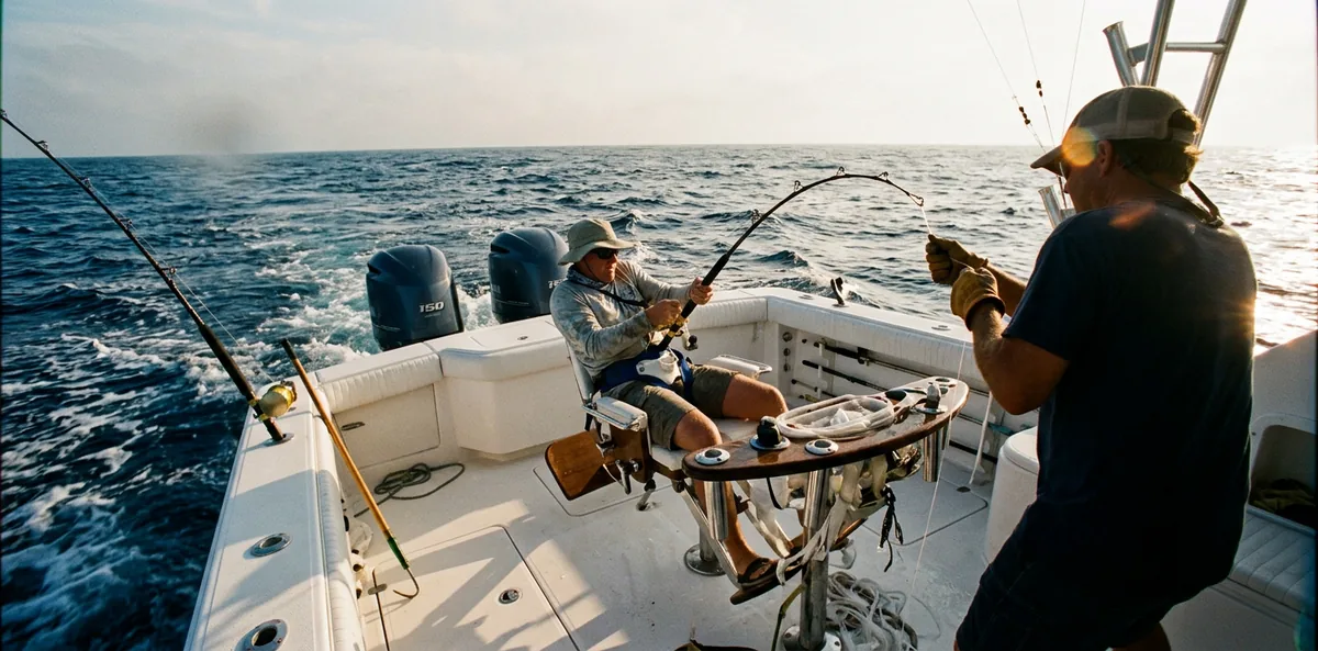 La barca è l'ufficio: Bertram, Viking, Hatteras da 40–65 ft con doppio diesel, capitano + mate professionisti, fighting chair con bucket harness, attrezzatura custom. Il mate prepara le esche naturali in mare (skipjack, cefalo, ballyhoo) — pre-riggate per spread daisy-chain. Alla mangiata l'angler si imbragato nella fighting chair mentre il mate libera le lenze e la barca arretra inseguendo il pesce.