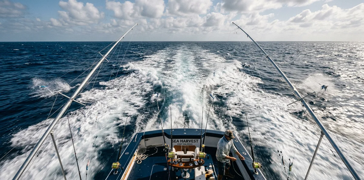 La velocità conta: 5-6 nodi per esche vive (slow troll), 6-8 nodi per artificiali skirted, fino a 12 nodi per i lure ad alta velocità per Wahoo. Il capitano legge la superficie in cerca di tide rips, bordi di corrente, linee di alghe, banchi di foraggio e attività di uccelli, i segnali dove i pelagici si nutrono.